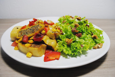 Heute gibt es mal wieder Maultaschen. Diese schwäbische Spezialität mache ich immer wieder gerne von Zeit zu Zeit. Ich nehme dafür die fertigen Maultaschen; vielleicht schaffe ich es aber in Zukunft auch mal diese selbst herzustellen. Schön angebraten zusammen mit Paprika und Mais ergibt das eine leckere schnelle Mahlzeit. Als Beilage habe ich einen frischen Friséesalat gemacht mit Schinkenwürfeln und Walnüssen. Viele Arten von Nüssen eignen sich ja super als Salat-Topping, Walnüsse mag ich aber besonders gerne (diese sind sogar aus dem Garten meiner Eltern). Einfach Lecker!