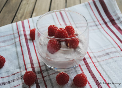 Alle Zutaten, außer den Himbeeren, zu einer glatten Masse verrühren. In Dessertgläschen füllen und mit den Himbeeren dekorieren. Bis zum Verzehr im Kühlschrank aufbewahren.