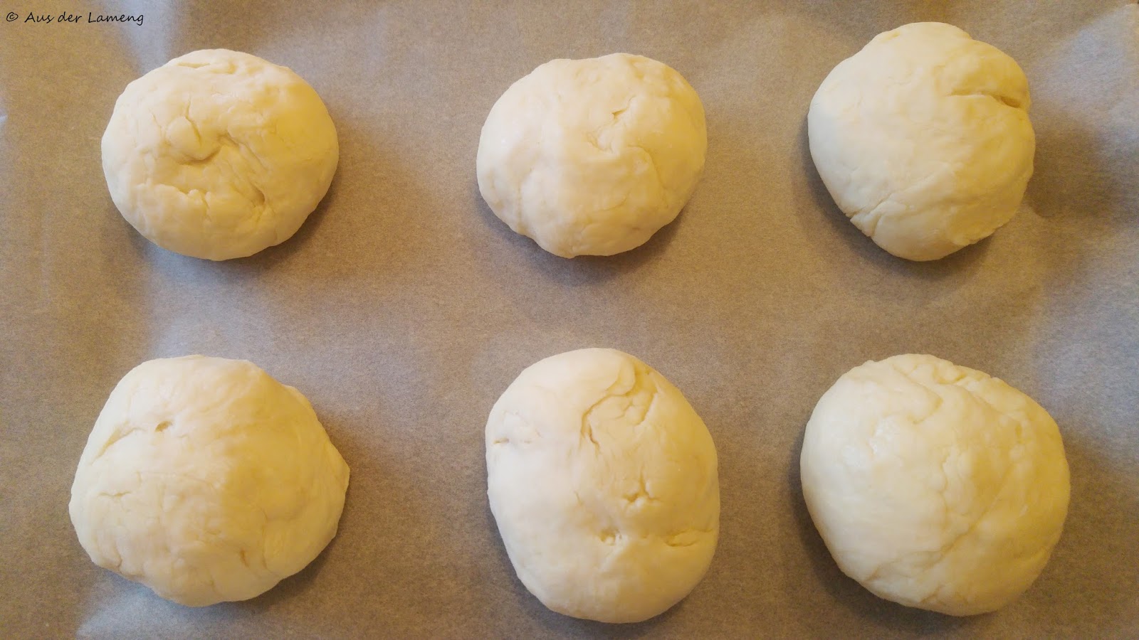 Am nächsten Morgen die Brioche nach Belieben formen und auf ein mit Backpapier ausgelegtes Backblech setzen. Zugedeckt nochmal 1.5 Sunden aufgehen lassen, bis sich das Volumen verdoppelt hat.