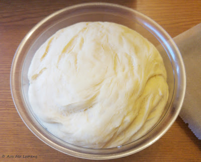 Danach das Salz dazugeben und gut verkneten. Eigentlich sollte der Teig an dieser Stelle 10min geknetet werden. Da ich aber keine Küchenmaschine habe, habe ich die Zutaten erst mit dem Handrührgerät verknetet. Nachdem es mit dem festen Teig nach wenigen Minuten schon heiss lief, habe ich noch etwas mit der Hand weitergeknetet, aber nicht so lange wie eigentlich mit der Küchenmaschine vorgesehen.