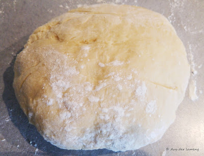 Die kalte Butter habe ich dann auch in kleinen Stücken mit den Händen untergeknetet bis ein schlozziger, klebriger Teig entstanden ist (mit der Küchenmaschine sind 10min empfohlen).