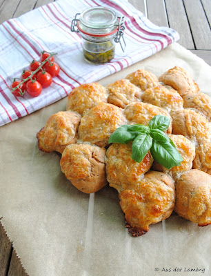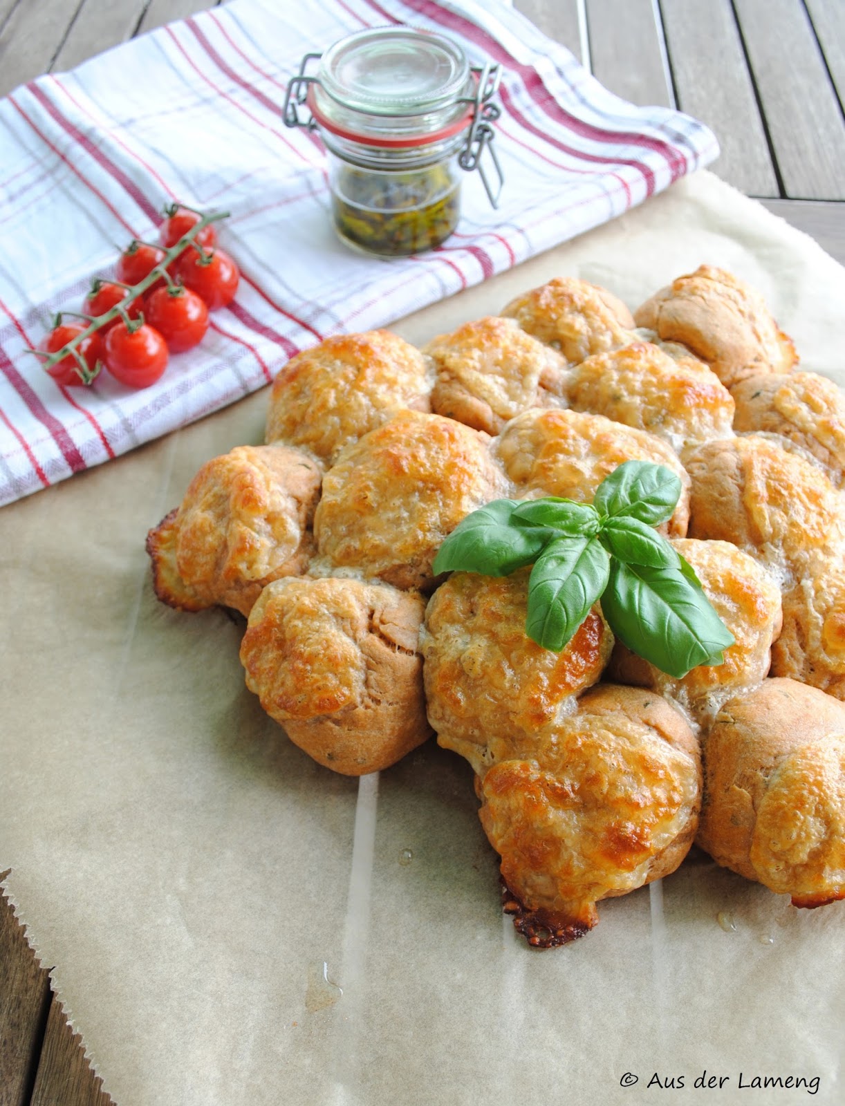 Heute ist es wieder an der Zeit für einen kleinen Partysnack. Wenn sich mal spontan ein paar Gäste ankündigen und man zu Bier oder Wein noch ein paar Leckereien reichen möchte, kommen diese herzhaften, kleinen Vollkornbrötchen gerade recht. Mit Basilikum und Tomate, fein abgerundet mit Bärlauch und Mozzarella. Dazu noch ein leckeres Stück Käse, perfekt!