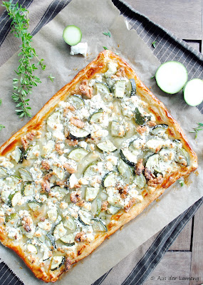 Eine schöne Idee für ein leichtes Essen an warmen Tagen. Und noch dazu schnell gemacht! Endlich konnte ich die erste Zucchini aus dem eigenen Garten ernten. Dazu noch Schafskäse und leckere Walnüsse, die das schön knackig machen, und fertig ist ein leckerer Belag für die Blätterteig-Tarte.